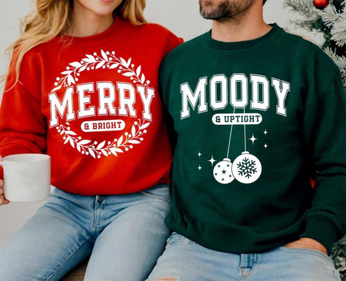 Merry and bright or moody and uptight on red or dark green crewneck sweatshirt