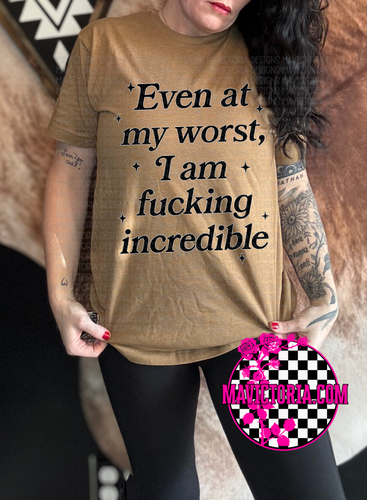 Even at my worst I am fucking incredible on pecan brown hoodie, crewneck, long sleeve or graphic tee